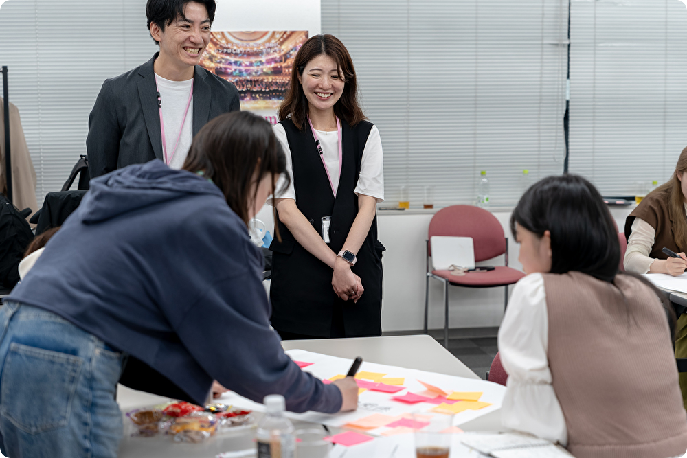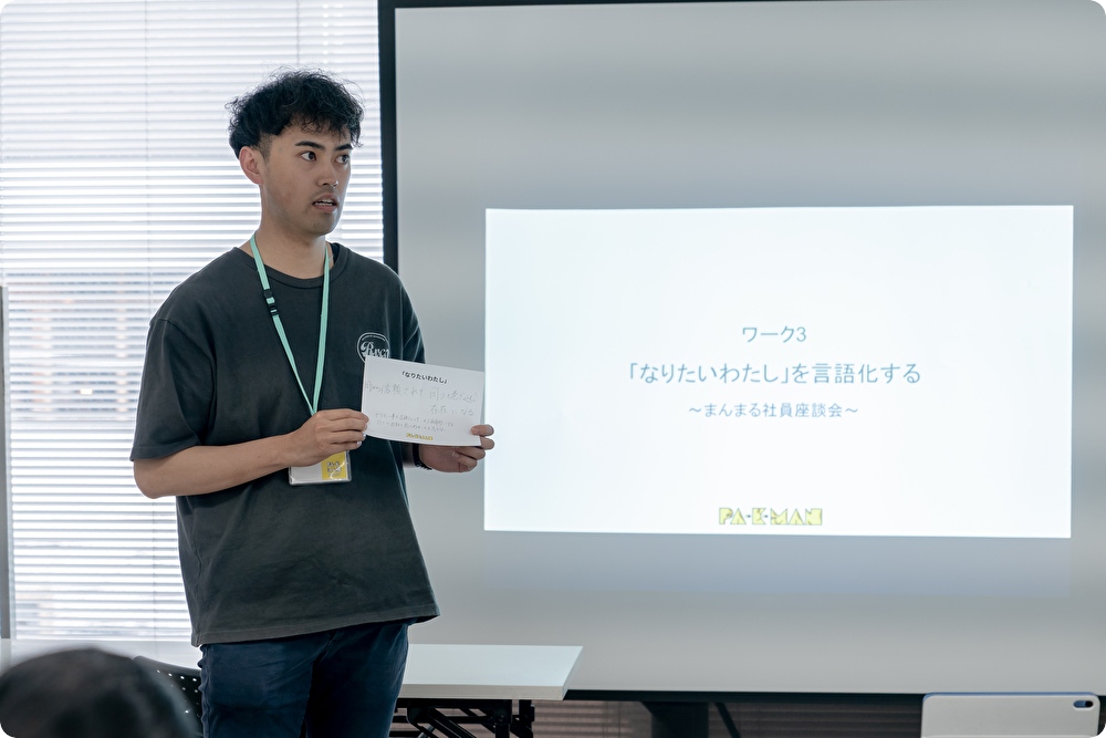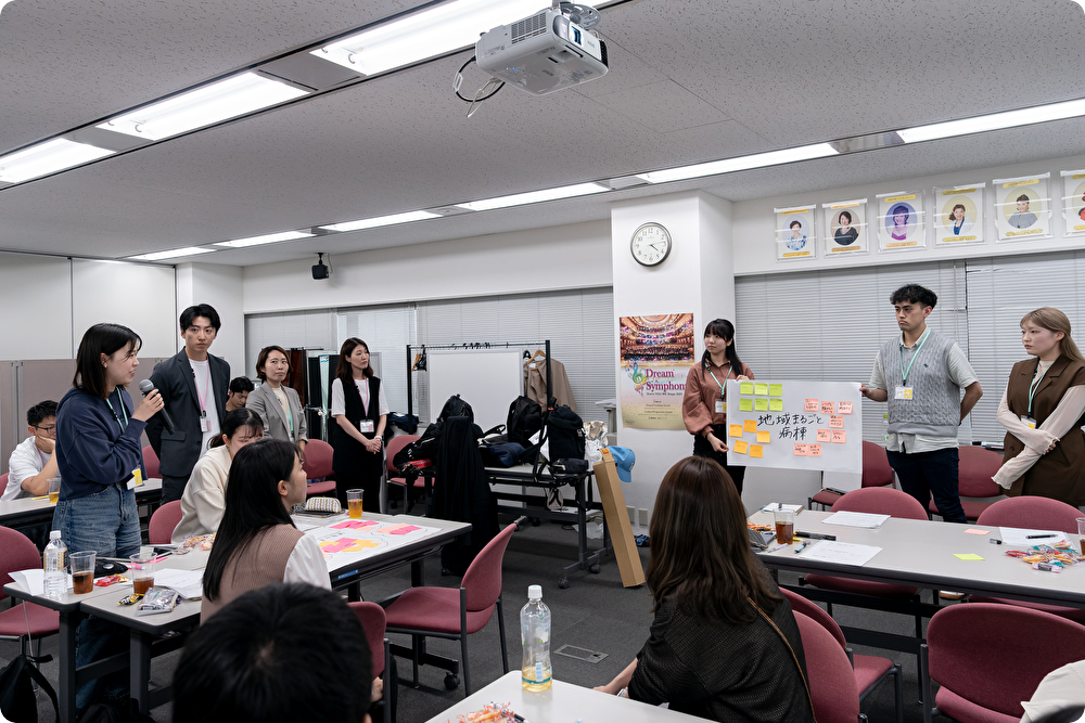 2日目の中心は「まんまる社員座談会」。hitotofrom/まんまる薬局のメンバーが失敗も含めた”歩み”を語り、学生は自分の将来像を言語化していきました。